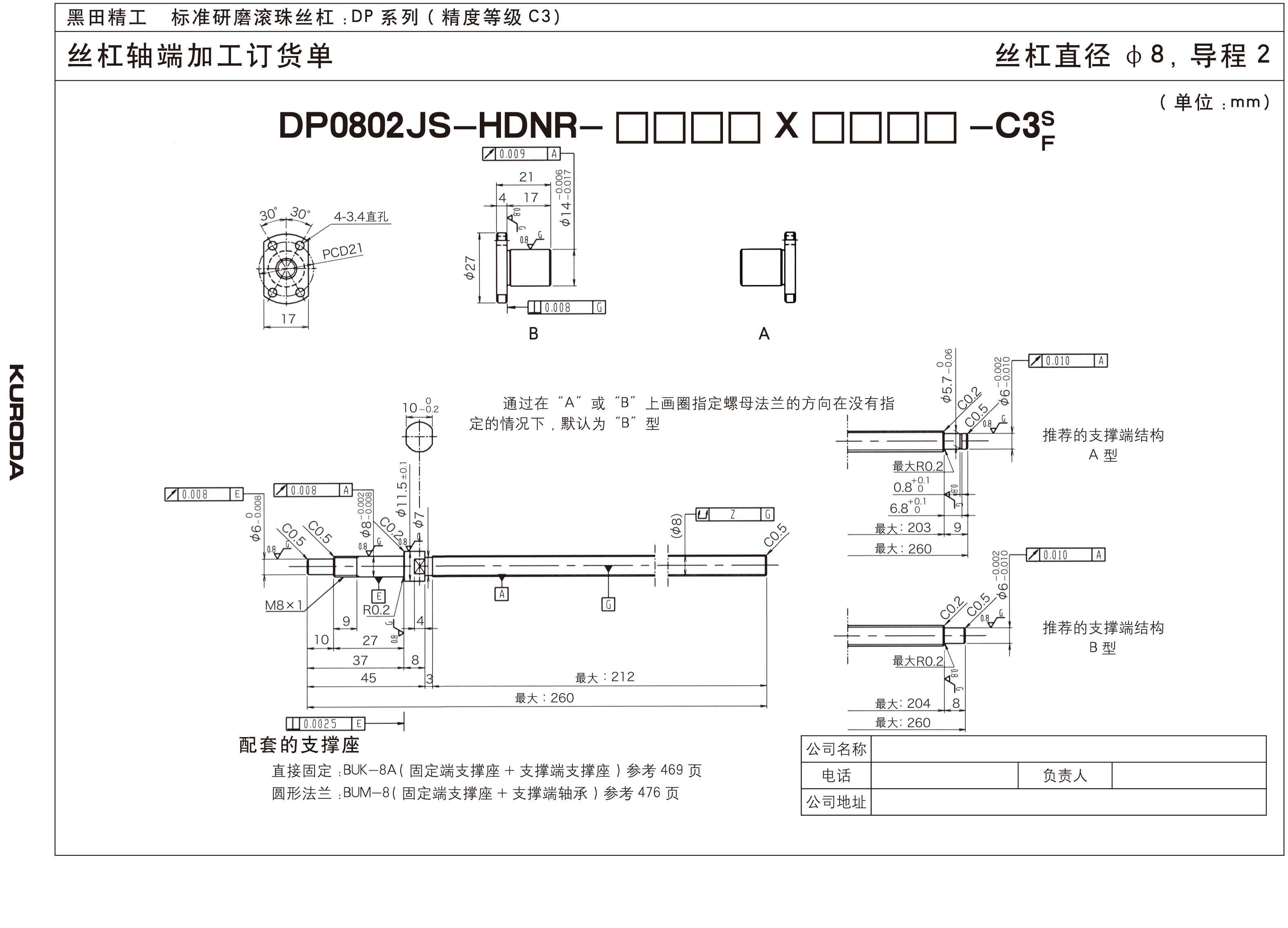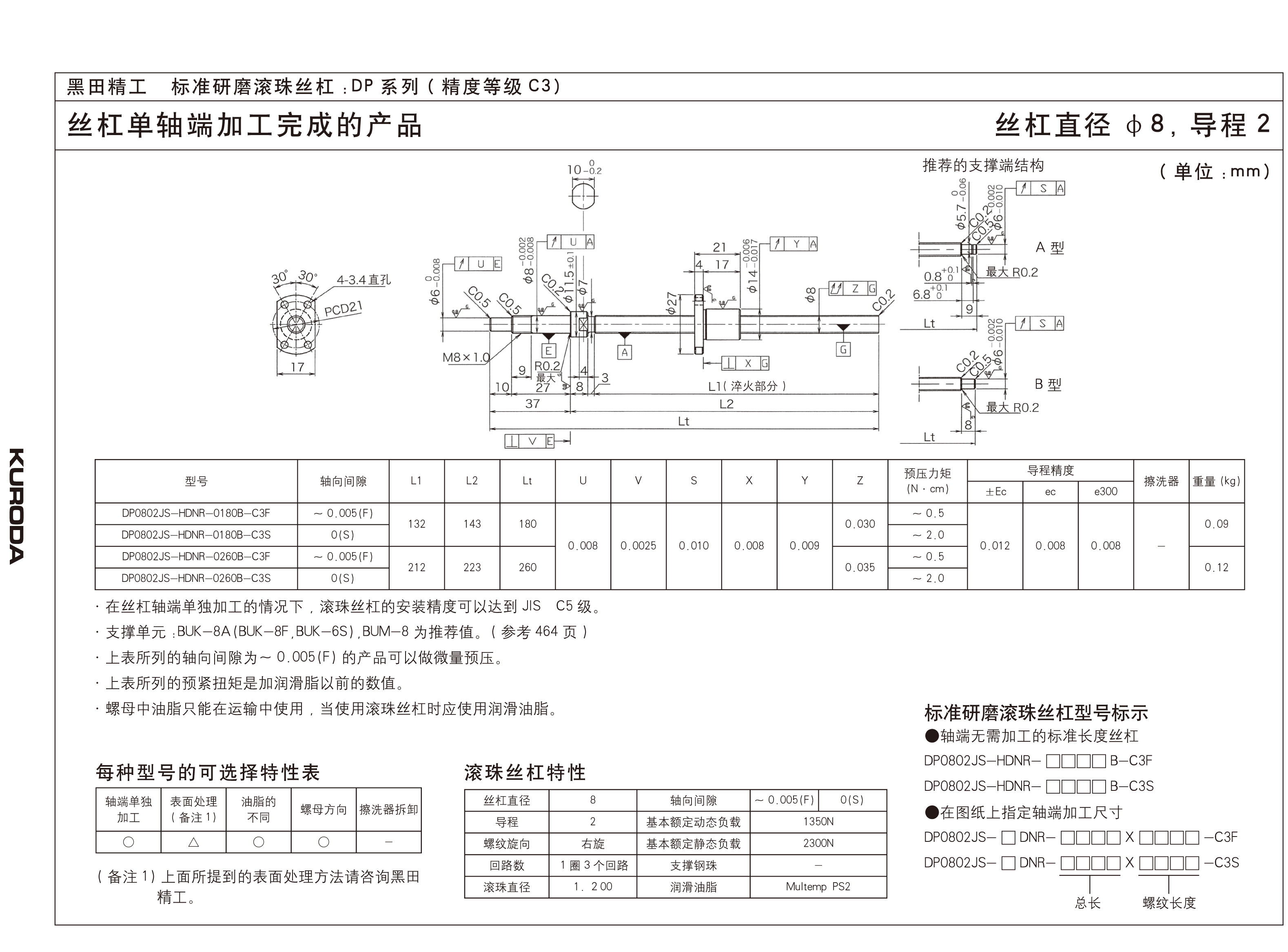 在JIS C3等级中,轴向间隙为S(预压型号)轴向间隙为F(小于0.005)的型号系列可以实现高精度进给