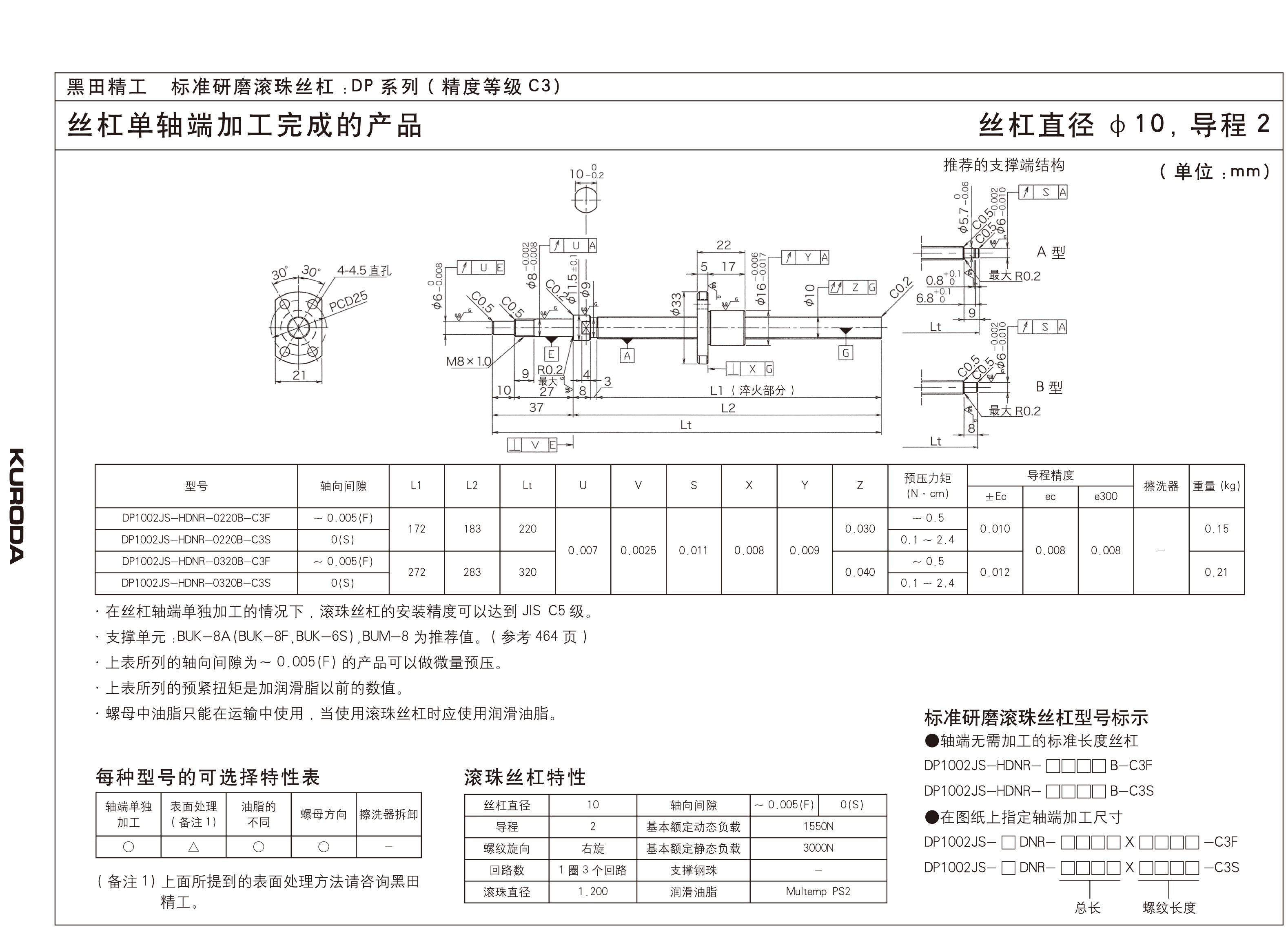 在JIS C3等级中,轴向间隙为S(预压型号)轴向间隙为F(小于0.005)的型号系列可以实现高精度进给
