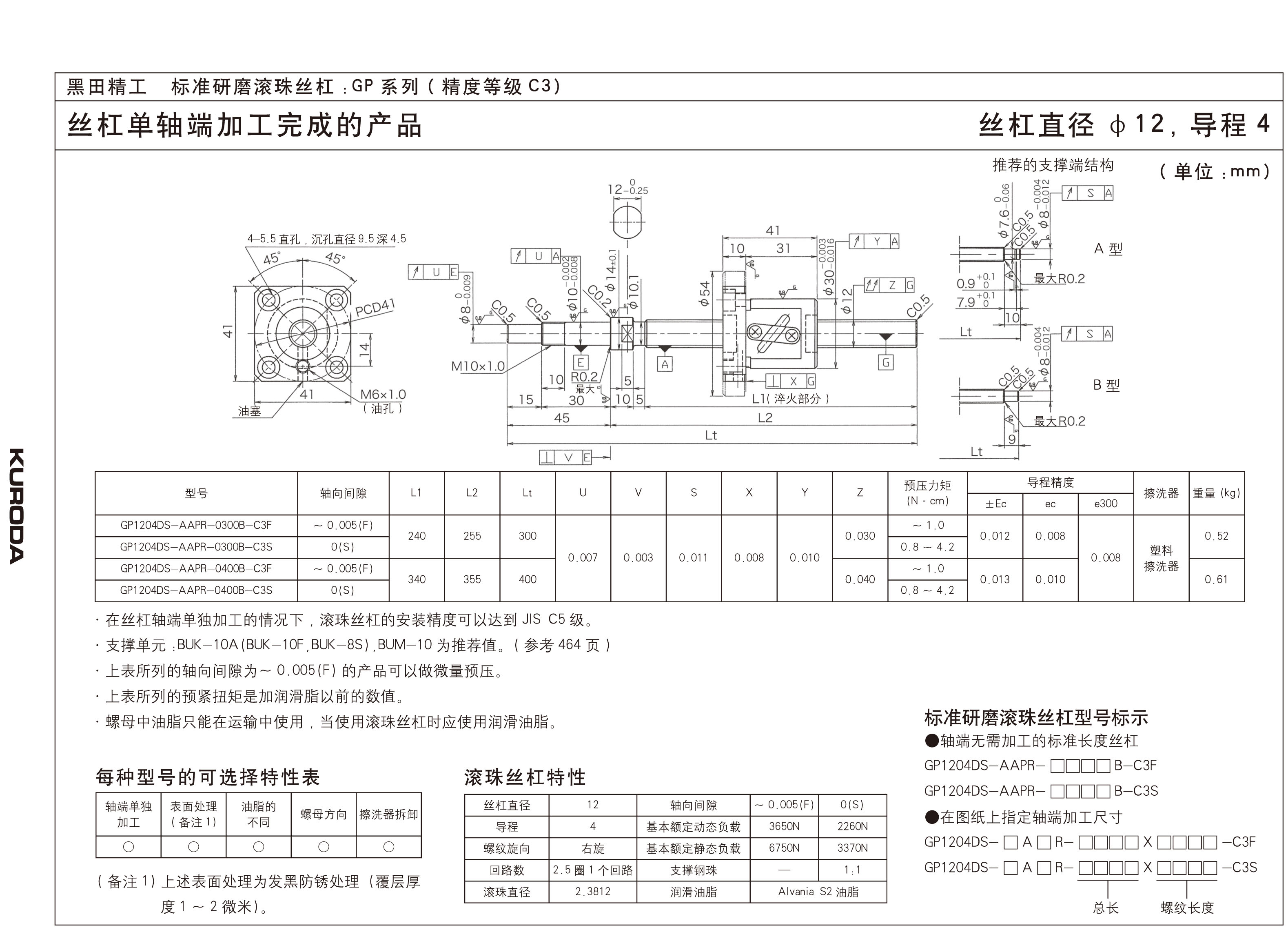 在JIS C3等级中,轴向间隙为S(预压型号)轴向间隙为F(小于0.005)的型号系列可以实现高精度进给