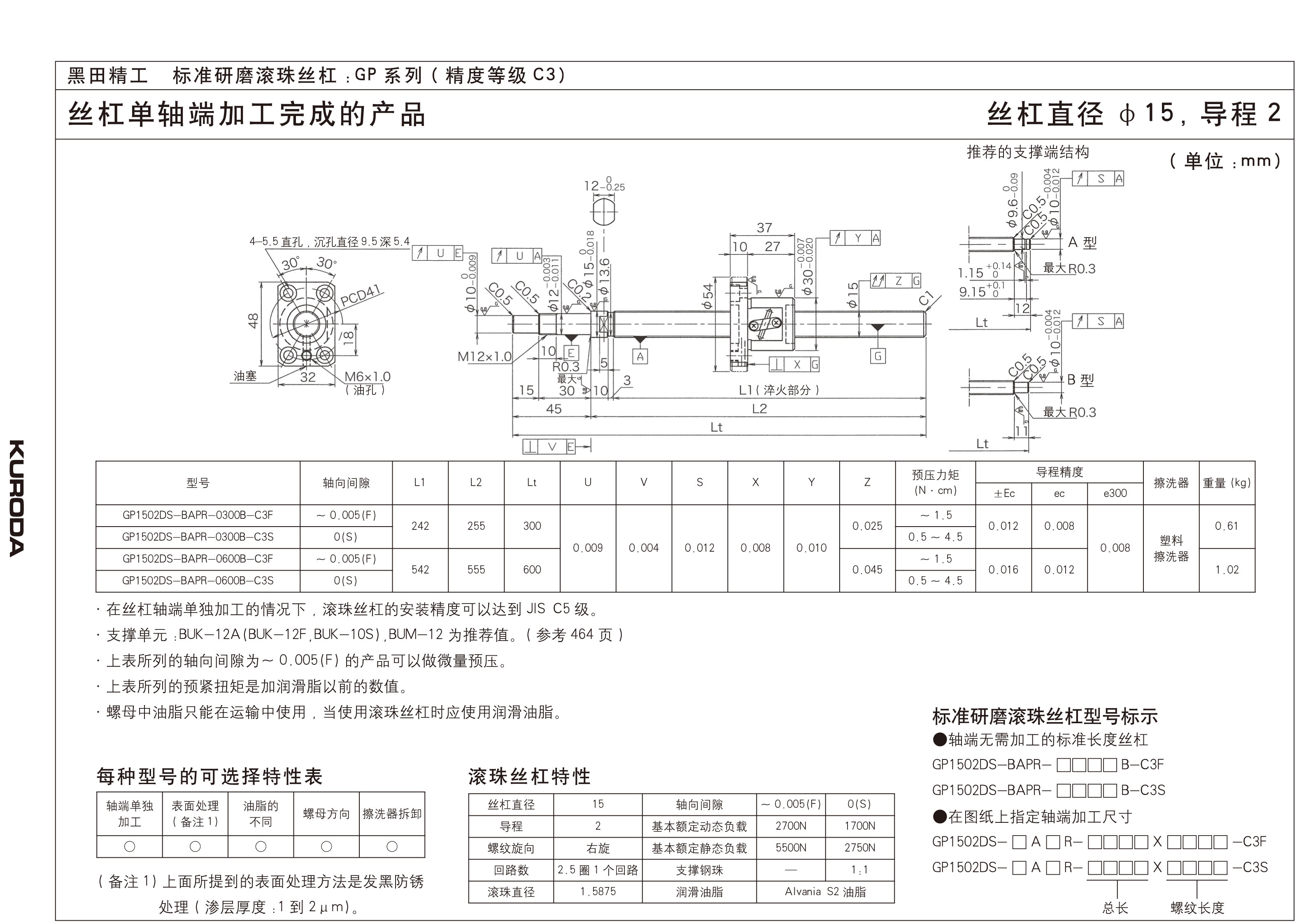 在JIS C3等级中,轴向间隙为S(预压型号)轴向间隙为F(小于0.005)的型号系列可以实现高精度进给