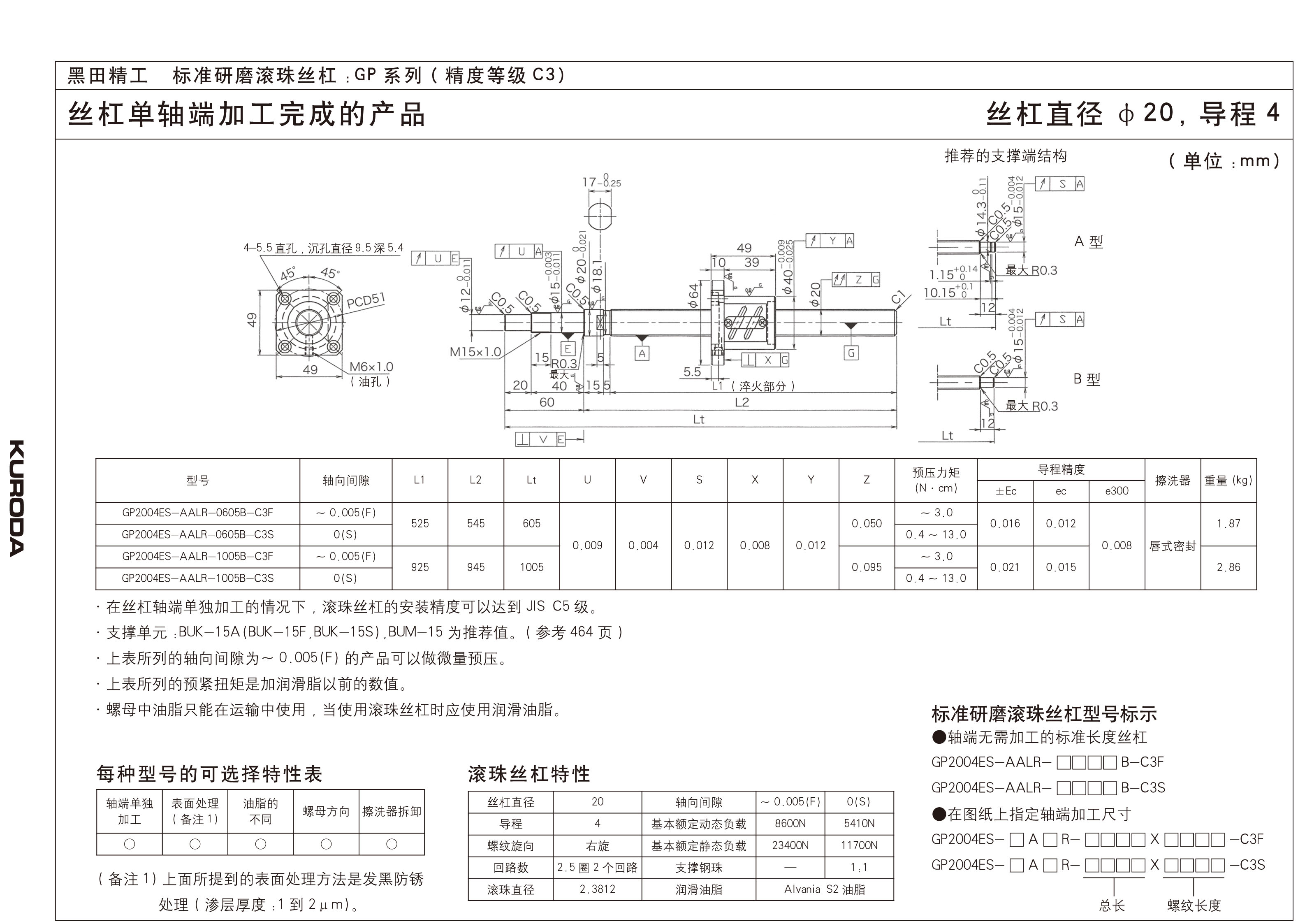 在JIS C3等级中,轴向间隙为S(预压型号)轴向间隙为F(小于0.005)的型号系列可以实现高精度进给